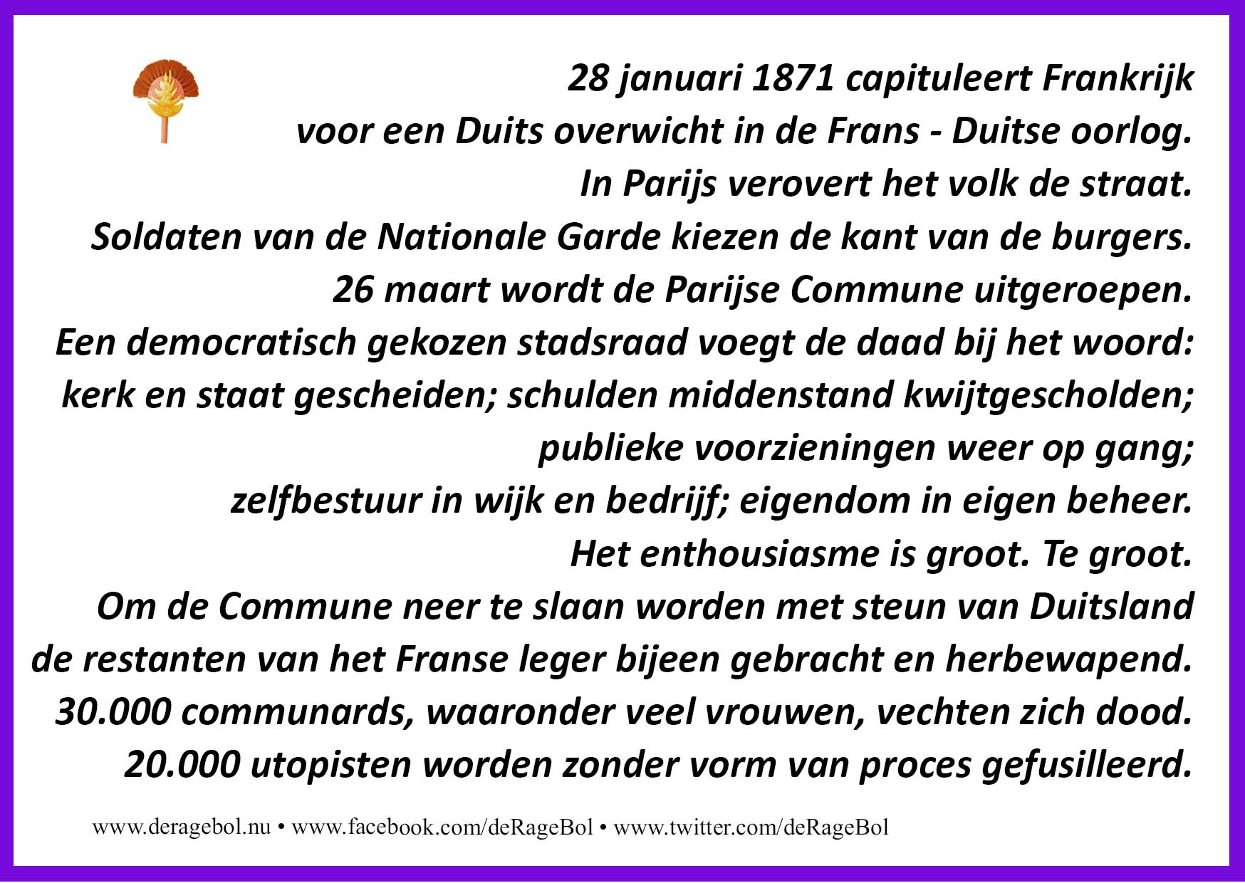 26 maart wordt de Parijse Commune uitgeroepen. Een democratisch gekozen stadsraad voegt de daad bij het woord: kerk en staat gescheiden; schulden middenstand kwijtgescholden; publieke voorzieningen weer op gang; zelfbestuur in wijk en bedrijf; eigendom in eigen beheer.