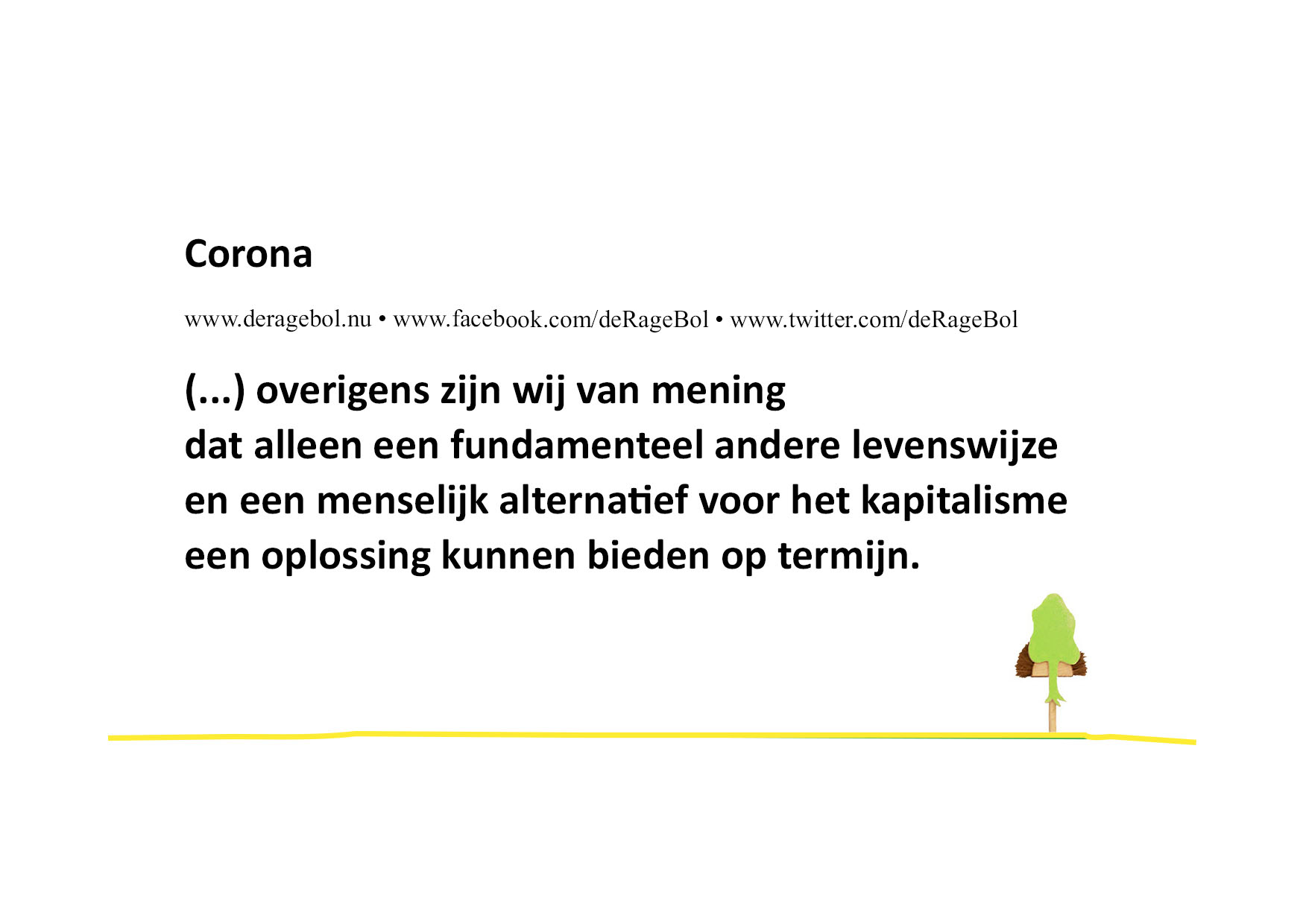 (...) overigens zijn wij van mening dat alleen een fundamenteel andere levenswijzeen een menselijk alternatief voor het kapitalisme een oplossing kunnen bieden op termijn.