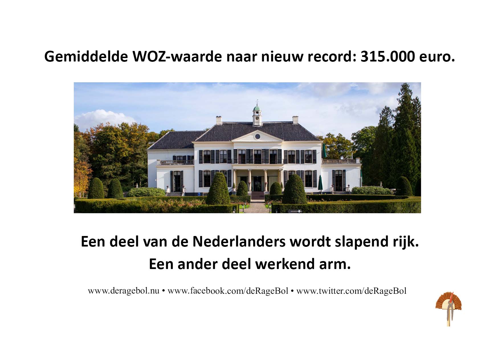 Gemiddelde WOZ-waarde naar nieuw record: 315.000 euro.Een deel van de Nederlanders wordt slapend rijk.Een ander deel werkend arm.