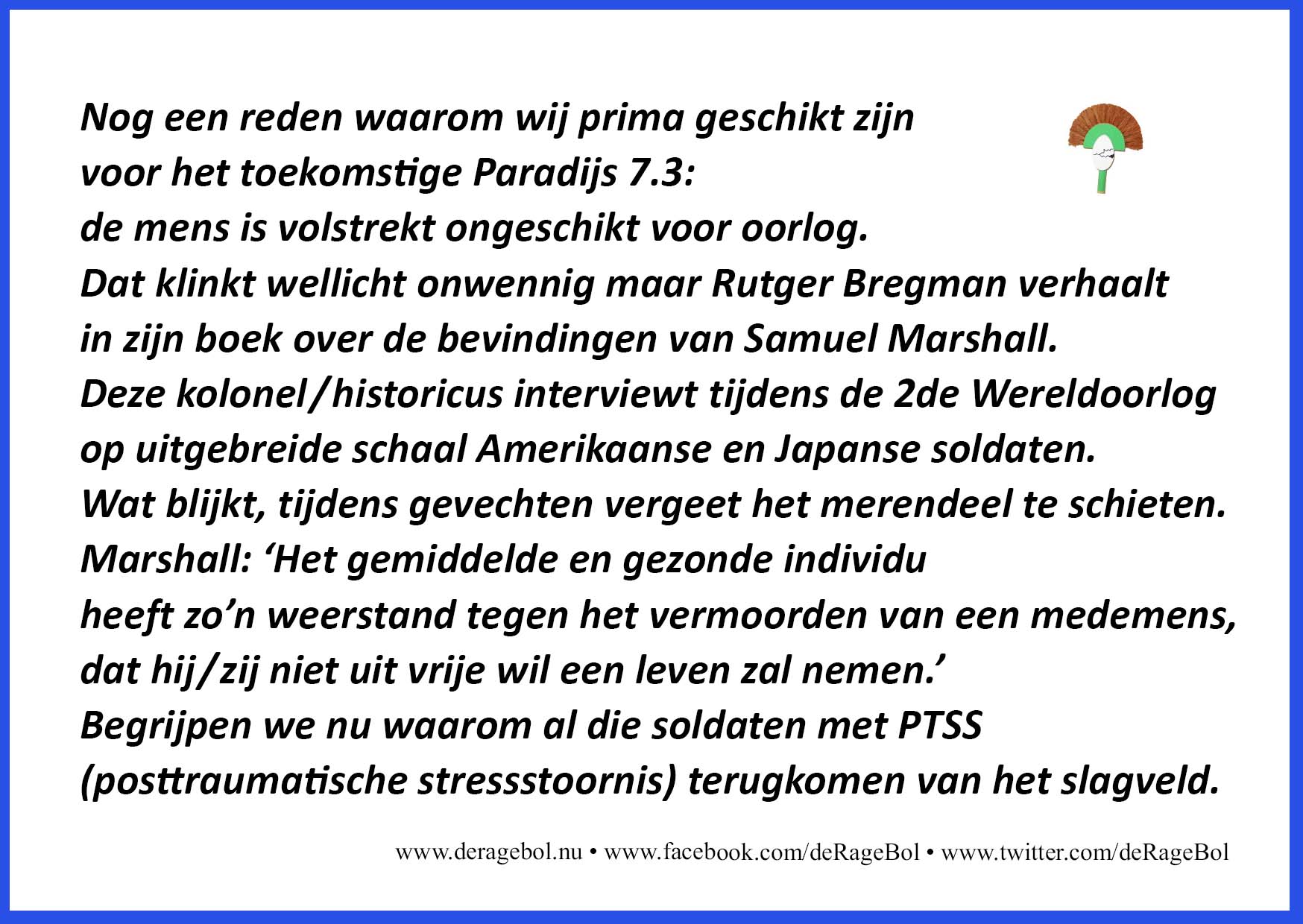 Dat klinkt wellicht onwennig maar Rutger Bregman verhaalt in zijn boek over de bevindingen van Samuel Marshall. Deze kolonel/historicus interviewt tijdens de 2de Wereldoorlog op uitgebreide schaal Amerikaanse en Japanse soldaten. Wat blijkt, tijdens gevechten vergeet het merendeel te schieten. Marshall: 'Het gemiddelde en gezonde individu heeft zo'n weerstand tegen het vermoorden van een medemens, dat hij/zij niet uit vrije wil een leven zal nemen.'