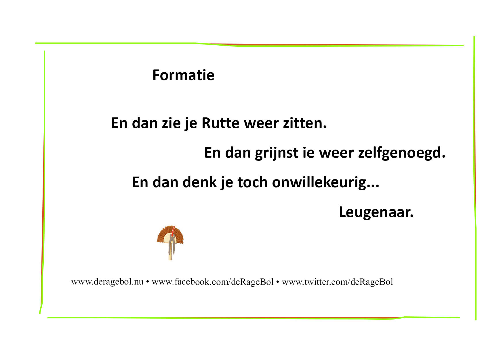 Formatie VVDEn dan zie je Rutte weer zitten.En dan grijnst ie weer zelfgenoegd.En dan denk je toch onwillekeurig...Leugenaar.