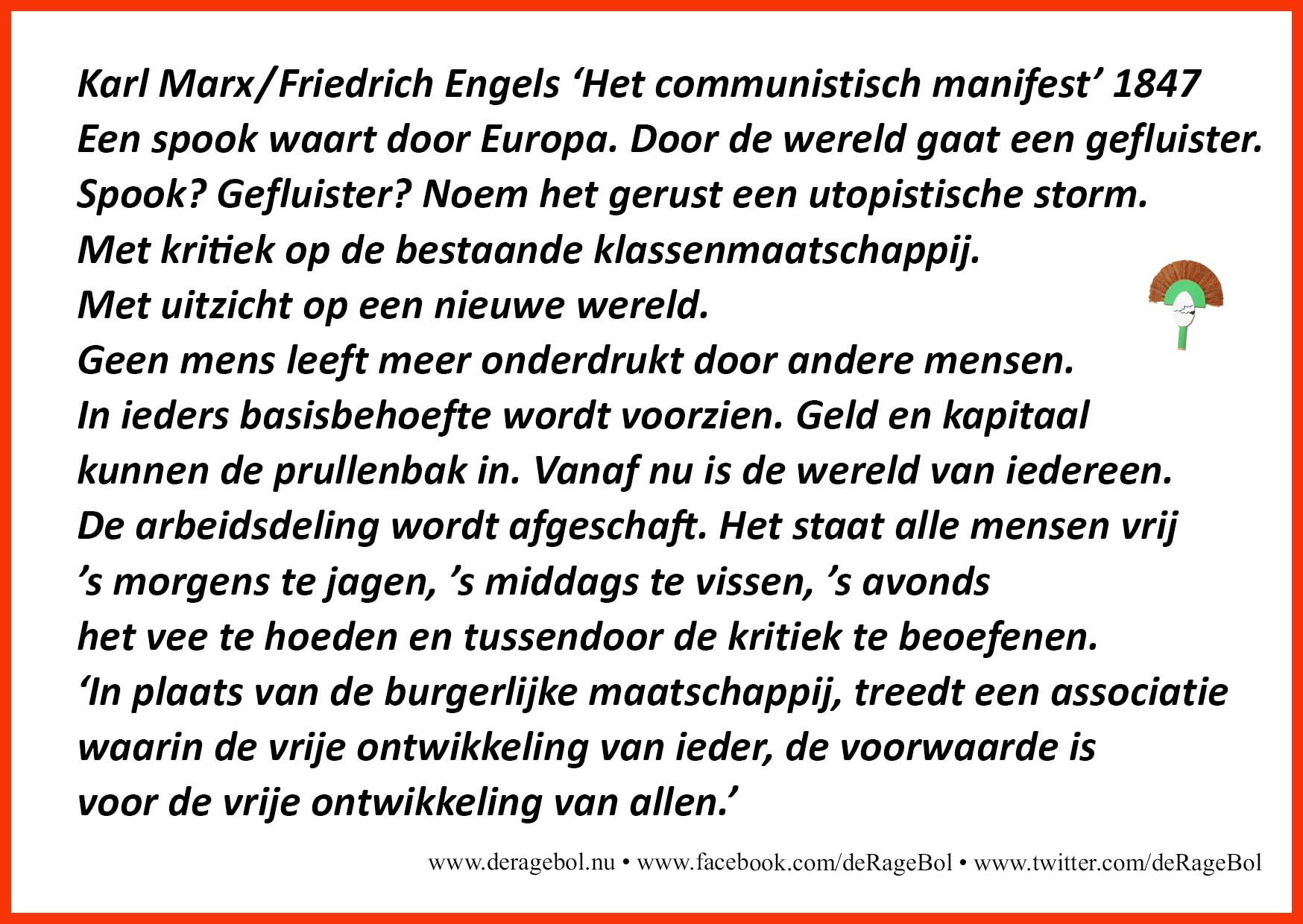 'In plaats van de burgerlijke maatschappij, treedt een associatie waarin de vrije ontwikkeling van ieder, de voorwaarde is voor de vrije ontwikkeling van allen.'
