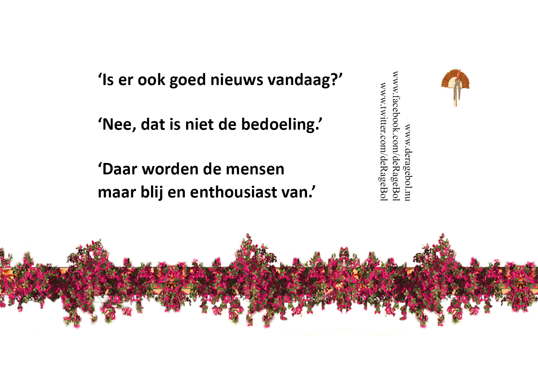 'Is er ook goed nieuws vandaag?''Nee, dat is niet de bedoeling.''Daar worden de mensen maar blij en enthousiast van.'