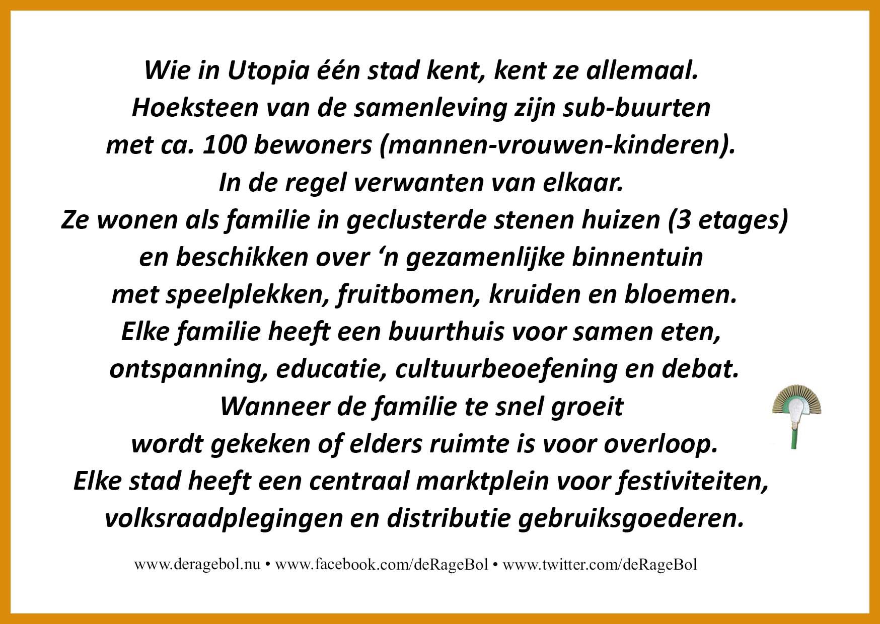Wie in Utopia één stad kent, kent ze allemaal. Hoeksteen van de samenleving zijn sub-buurten met ca. 100 bewoners (mannen-vrouwen-kinderen).